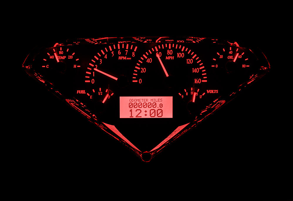 The V-shaped cluster found in 1955-59 Chevy pickups (sorry, not GMC) is unmistakable and has found its way into more than a few custom vehicles. Capitalizing on the space, you’ll find a single LCD message center large enough to display two readings at one time, nestled in the middle of six dedicated analog instruments. Fits stock or aftermarket bezel (available separately).