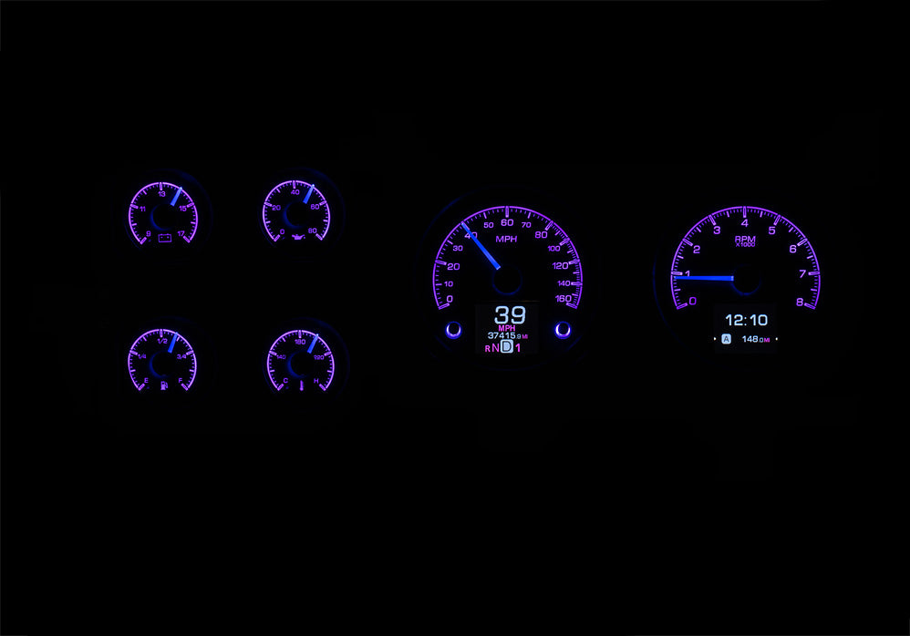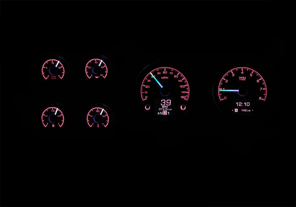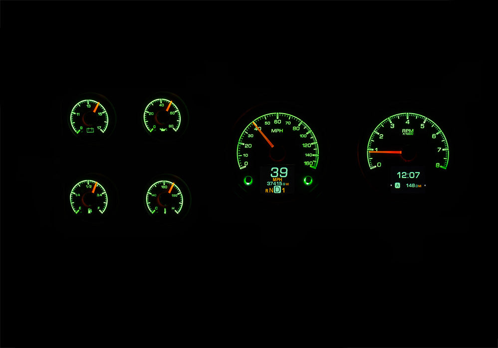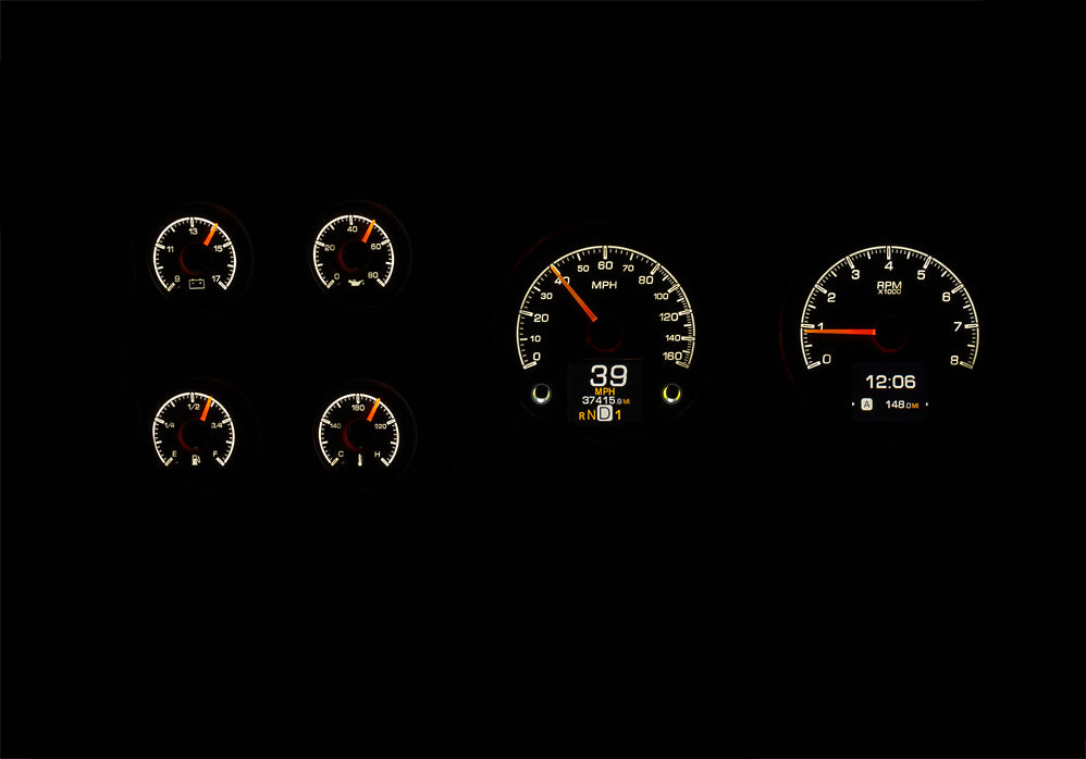 Still affordable and easy to find, 1973-87 Chevy and GMC pickups are gaining ground in the truck popularity contest. We love ‘em for the stock cluster arrangement; a big speedo and tach front and center with the satellites to the side. We added a TFT-display in each large opening for the utmost in customization; view any parameters you like while the integrated buttons make calibration a cake-walk. Stick this in your 1973-91 Blazer, Suburban or heavy duty pickup too!