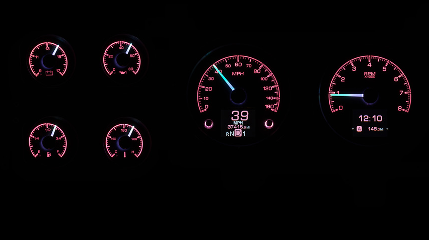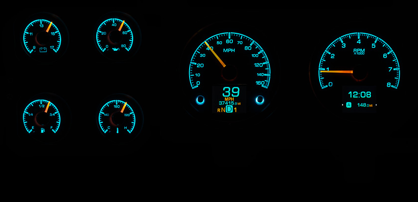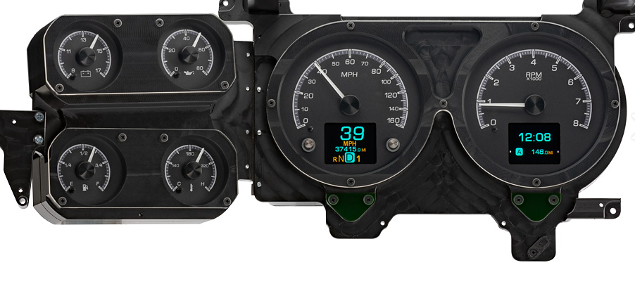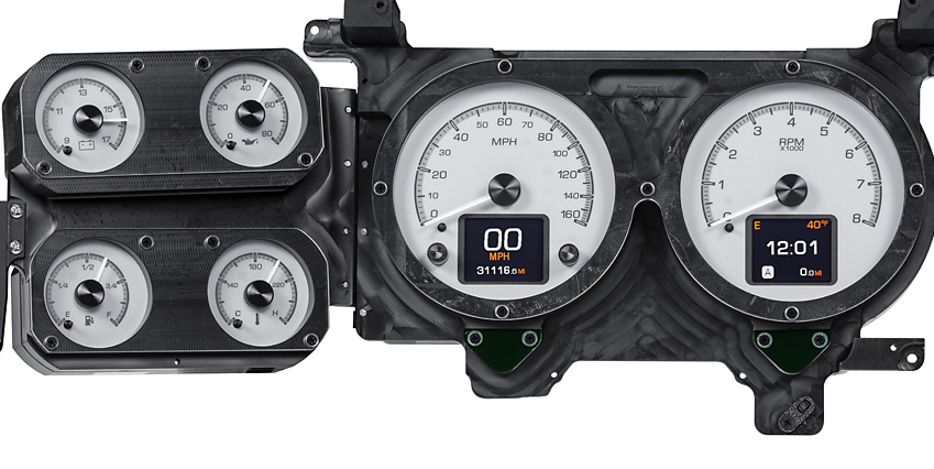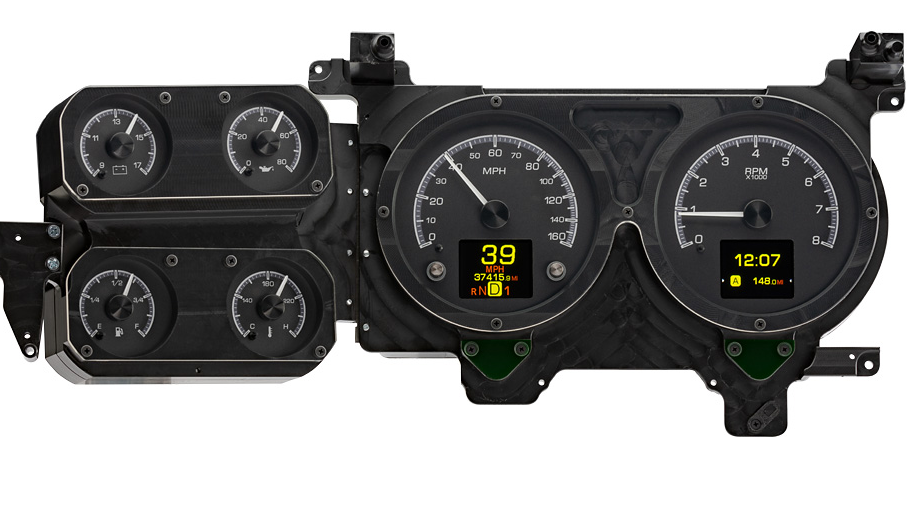 Still affordable and easy to find, 1973-87 Chevy and GMC pickups are gaining ground in the truck popularity contest. We love ‘em for the stock cluster arrangement; a big speedo and tach front and center with the satellites to the side. We added a TFT-display in each large opening for the utmost in customization; view any parameters you like while the integrated buttons make calibration a cake-walk. Stick this in your 1973-91 Blazer, Suburban or heavy duty pickup too!